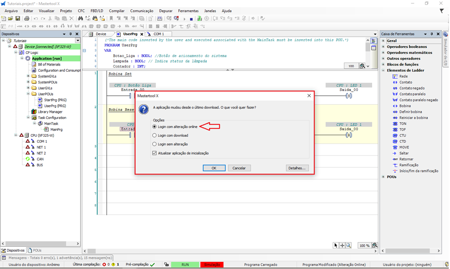 - O usuário passa a visualizar o código que está em execução no CLP, mesmo que ele seja diferente do projeto aberto.