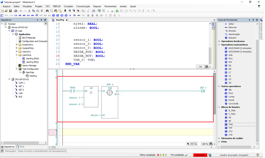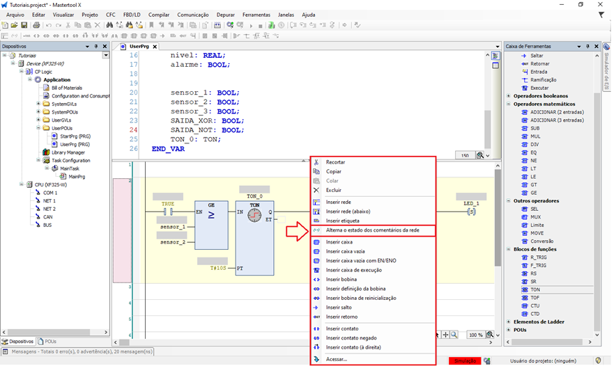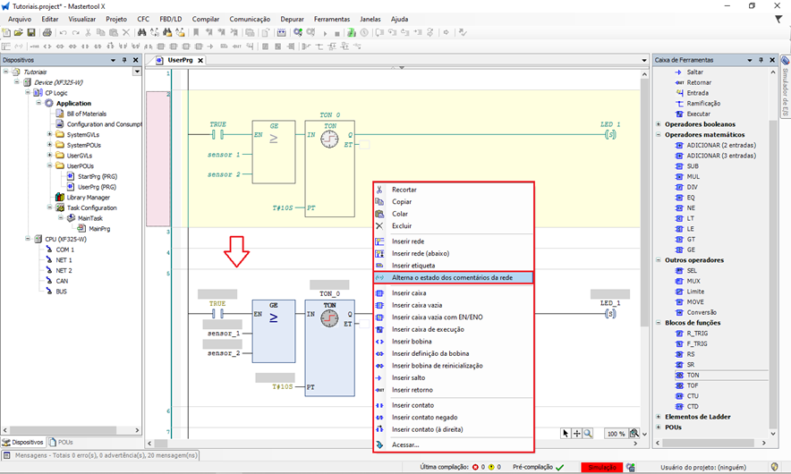 O recurso de comentário de rede no MasterTool X é uma ferramenta simples e poderosa para testes, manutenção e depuração, permitindo ativar e desativar partes da lógica de forma rápida, segura e reversível.