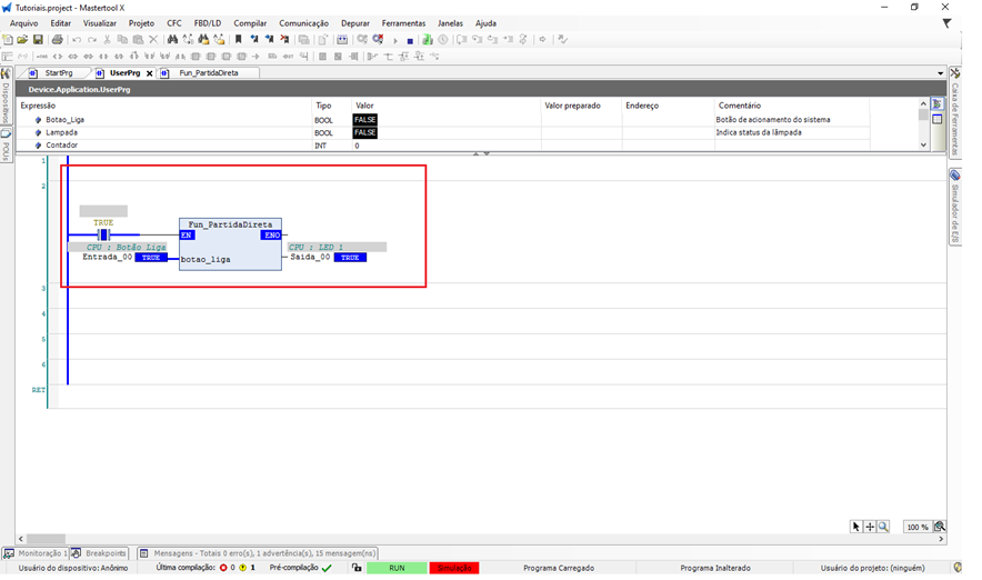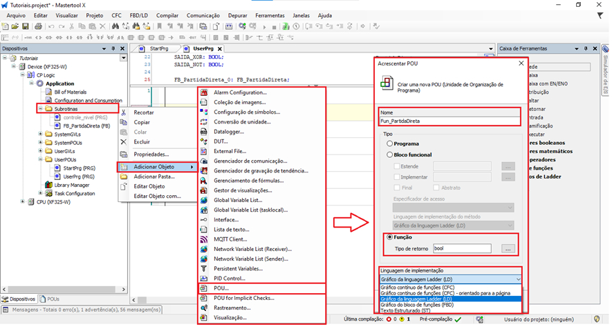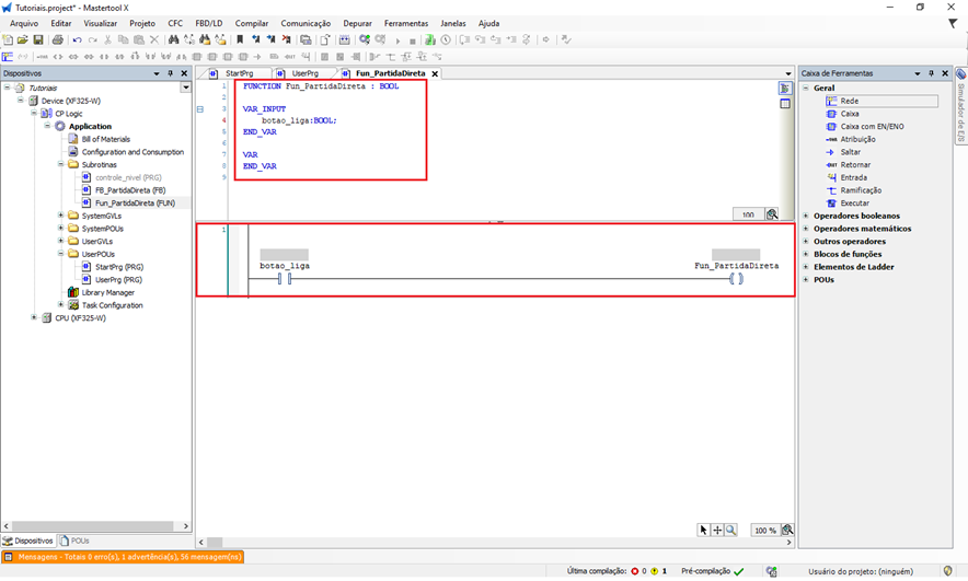 Neste exemplo, será criada uma função chamada fun_partida_direta, com retorno do tipo BOOL, implementada em Ladder (LD).