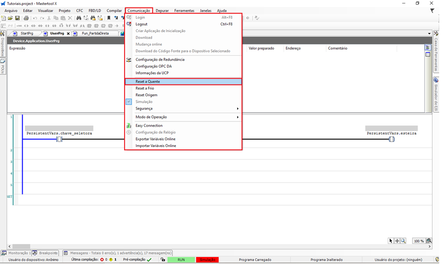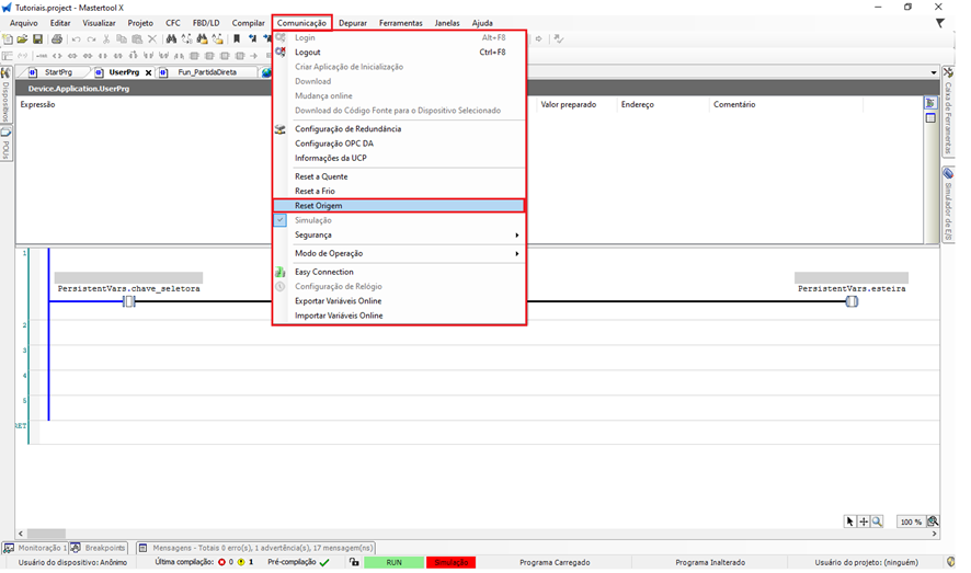 Durante o desenvolvimento, testes ou manutenção de uma aplicação, pode ser necessário reinicializar o CLP. No MasterTool IEC XE, isso pode ser feito pelo menu superior Comunicação, onde estão disponíveis três tipos de reset: Reset Quente, Reset Frio e Reset de Origem.