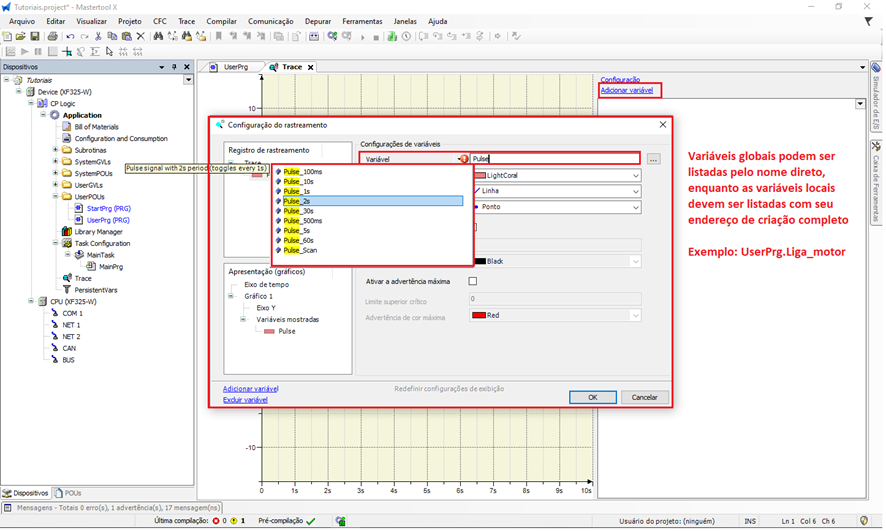 Diferente da simples visualização online das variáveis, o Trace permite acompanhar a evolução dos valores de forma contínua, facilitando a análise do sistema.
