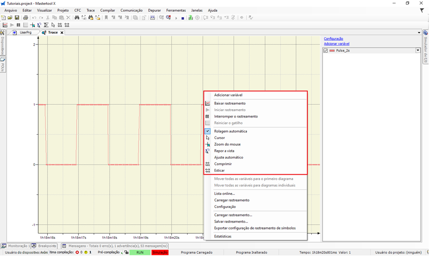 Essas opções podem ser acessadas clicando com o botão direito do mouse sobre a área do Trace, abrindo o menu de contexto com as funções de controle do rastreamento.