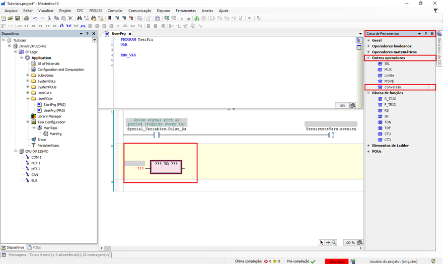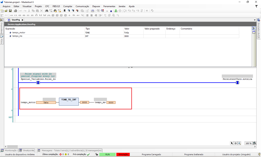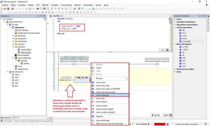 O objetivo deste tutorial é explicar como inserir e utilizar o operador de conversão que converte variáveis do tipo time para tipo inteiro em um projeto do MasterTool X.