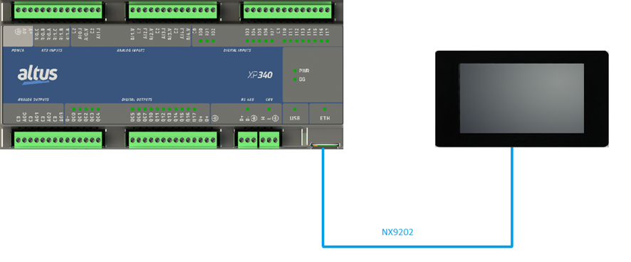 Neste tutorial, a porta Ethernet do CLP XP340 foi conectada à porta Ethernet da IHM P2 utilizando o cabo NX9202. Ambos os equipamentos devem estar na mesma faixa de IP ou possuir roteamento configurado para permitir a comunicação entre si.