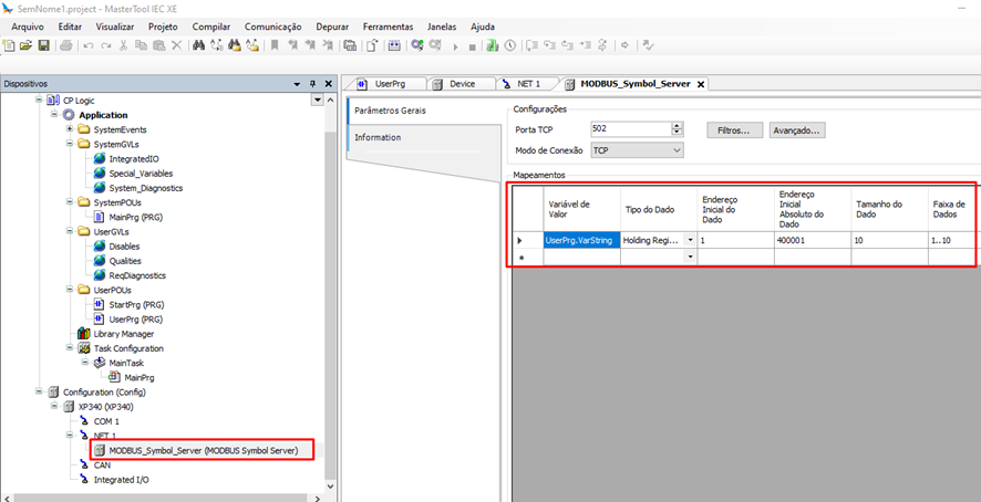 Após criar a variável no CLP, ela deve ser mapeada na tabela Modbus para que a IHM consiga realizar a leitura e escrita dos registradores correspondentes.