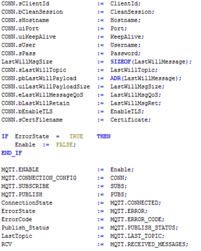 Na estrutura da MQTT_START (PRG), vamos ligar as variáveis criadas com as variáveis do bloco.