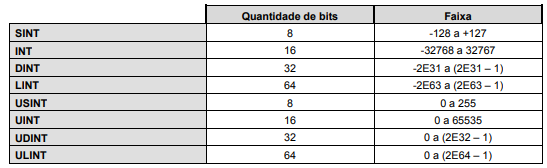 Quando aplicável incluir quais os tipos de tipos inteiros não podem ser representados no tipo de UCP em questão. Ex: Os controladores DU350 e DU351 não suportam tipos inteiros de variáveis de 64 bits. Este tipo é o LREAL. Quando aplicável incluir quais os tipos de tipos inteiros não podem ser representados no tipo de UCP em questão. Ex: São eles: LWORD, LINT e ULINT.