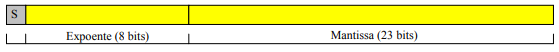Existem representações de ponto flutuante de 32 e 64 bits. No caso 32bits ocupam quatro bytes de memória (32 bits), armazenando o valor conforme a figura a seguir: