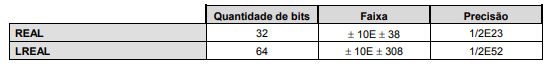 Os formatos apresentados são os estabelecidos pela norma IEC61131. Ambos os tipos são os padrões da norma IEC 754. No caso do REAL ele é o que é definido pela norma como floating point single precision (ponto flutuante de precisão simples). Já o LREAL é definido pela norma como floating point double precision (ponto flutuante de precisão dupla).