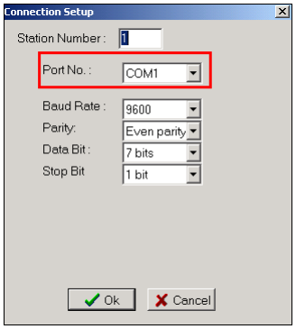- No campo Port No selecione a COM do PC utilizada e clique em OK.
