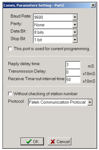 - Para configurar os parâmetros do canal serial que vai realizar a comunicação com o Inversor ir ao menu: PLC -> Setting -> Port2 Parameter.