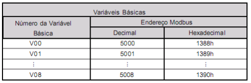 - As Variáveis Básicas estão disponíveis nos endereços MODBUS conforme tabela abaixo: