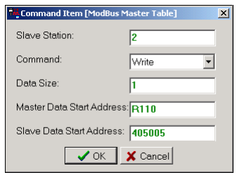 - Esta relação realiza a escrita em 1 variável no escravo número 2. O endereço em que será realizada a escrita é o 5005 (45005) que corresponde à memória R110 do CP.