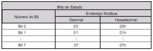 - Através da rede MODBUS, é possível acessar os Bits de Estado através dos endereços: