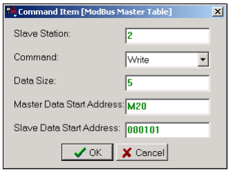 - Esta relação realiza a escrita de 5 variáveis no escravo número 2. Os endereços escritos são 101 a 105 (00101 a 00105) correspondentes as variáveis M20 a M25 do CP.