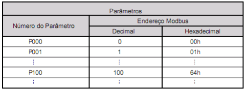 - Todos os registradores (parâmetros e variáveis básicas) são tratados como registradores do tipo holding, referenciados a partir de 40000 ou 4x, enquanto os bits são referenciados a partir de 0000 ou 0x. Os bits de estado possuem as mesmas funções dos bits 8 a 15 do estado lógico (variável básica 2). Estes bits estão disponíveis apenas para leitura, sendo que qualquer comando de escrita retorna erro para o mestre.