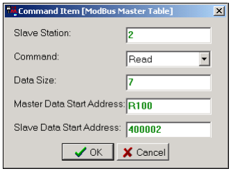- Esta relação realiza a leitura de 7 parametros do escravo número 2. Os endereços lidos são 2 a 8 (40002 a 40008) e colocados nas memórias R100 a R106 respectivamente.