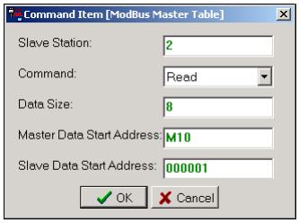 - Esta relação realiza a leitura de 8 variáveis do escravo número 2. Os endereços lidos são 1 a 8 (00001 a 00008) correspondentes as variáveis M10 a M17 do CP.